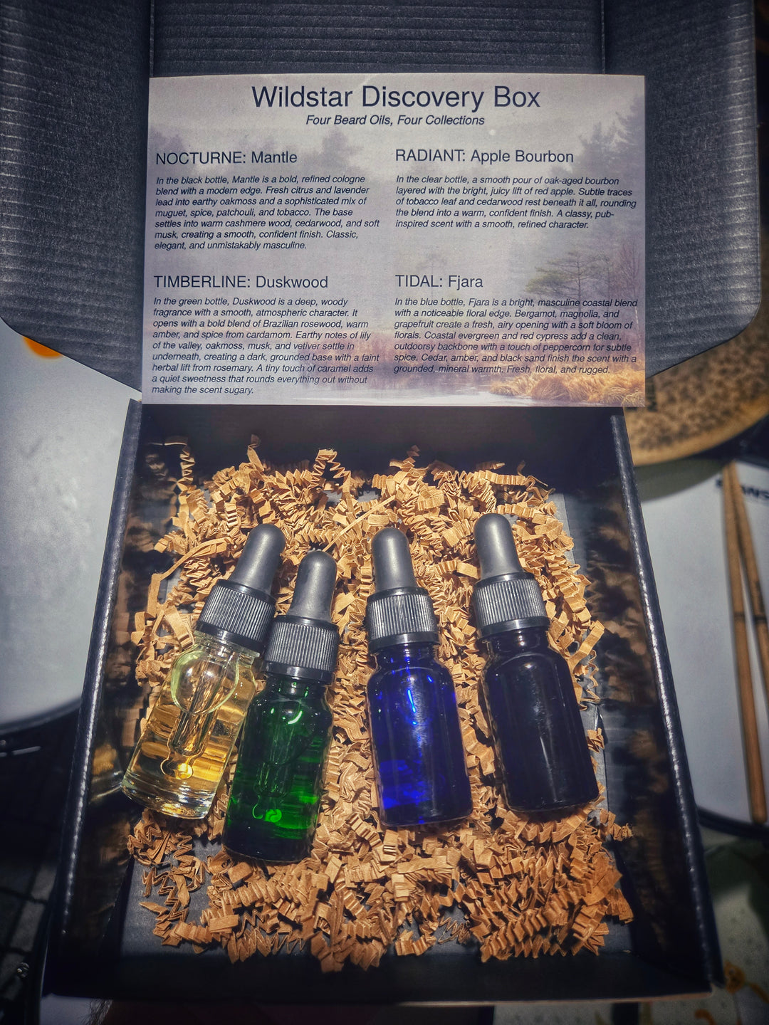 The Discovery Box is the perfect introduction to Wildstar Beard Co. — a curated set featuring one handcrafted beard oil from each of our four scent collections. Whether you're choosing your first bottle or looking for a signature scent, this box is designed to help you explore our entire lineup with confidence.